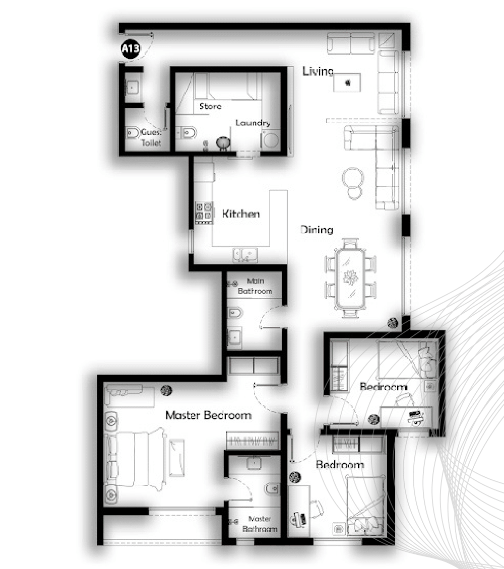 مدخل A13 يفتح على ممر خدمي يضم دورة مياه للضيوف يليها غرفة غسيل متصلة بـ مستودع، ثم يصل إلى المطبخ شبه المنفصل في مركز المسكن. تمتد على الواجهة اليمنى مساحة اجتماعية رحبة بتخطيط مفتوح تجمع Living وDining. في الجناح الخاص تتوزع غرفة نوم رئيسية مزوّدة بـ حمام داخلي وخزائن، إضافة إلى غرفتي نوم ثانويتين على الجهة اليمنى يخدمهما حمام رئيسي قريب من الممر؛ توزيع يوفّر فصلًا واضحًا بين الضيافة والخصوصية ومسارات حركة قصيرة.