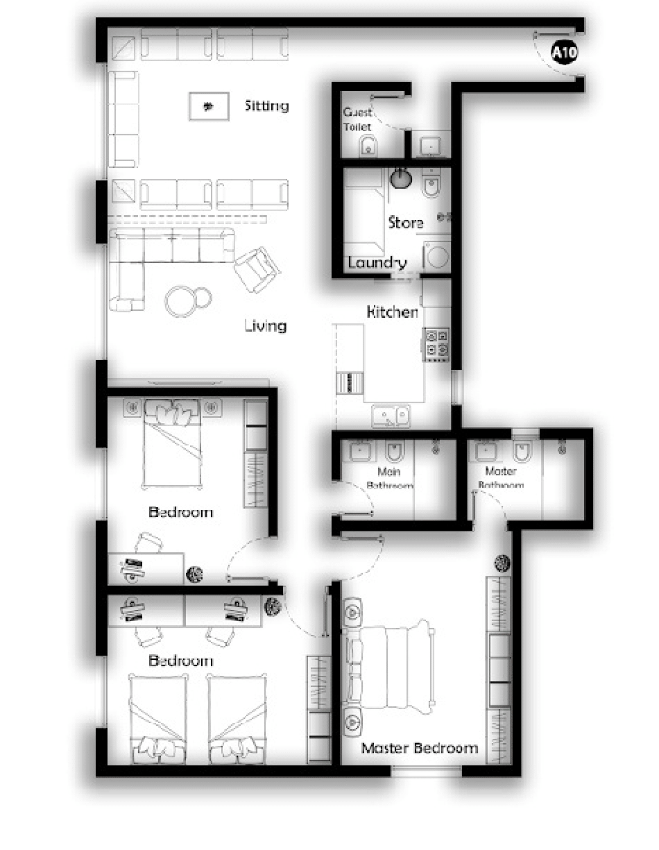 مدخل A10 يقود إلى جناح خدمي متكامل يضم دورة مياه ضيوف ثم مخزن وغرفة غسيل متصلين بـ المطبخ شبه المنفصل، قبل أن تنفتح الحركة على مساحة معيشة رحبة بتخطيط مفتوح تجمع Sitting وLiving على الواجهة. في الجناح الخاص تتوزع غرفة نوم رئيسية مزوّدة بـ حمام داخلي وخزائن، إضافة إلى غرفتي نوم ثانويتين على الجهة اليسرى يخدمهما حمام رئيسي يتوسط الممر؛ توزيع يحقق فصلاً واضحًا بين الضيافة والخصوصية ومسارات حركة قصيرة.