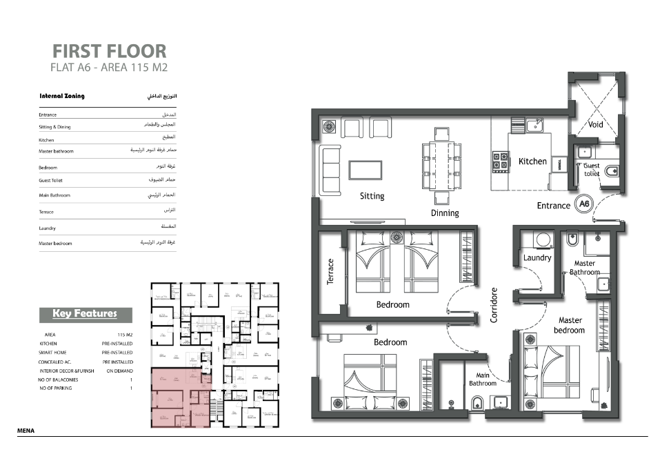 شقة A6 (الدور الأول) بمساحة 115 م² بتصميم عائلي رحب: معيشة وطعام مفتوحة متصلة بمطبخ مجهّز مسبقًا، وممر يضمن خصوصية غرف النوم. تتضمن غرفة غسيل وتراس لطيف بجانب إحدى غرف النوم، إضافة إلى سمارت هوم وتكييف مخفي وتشطيبات قابلة للتخصيص—خيار عملي ومريح للعائلات.