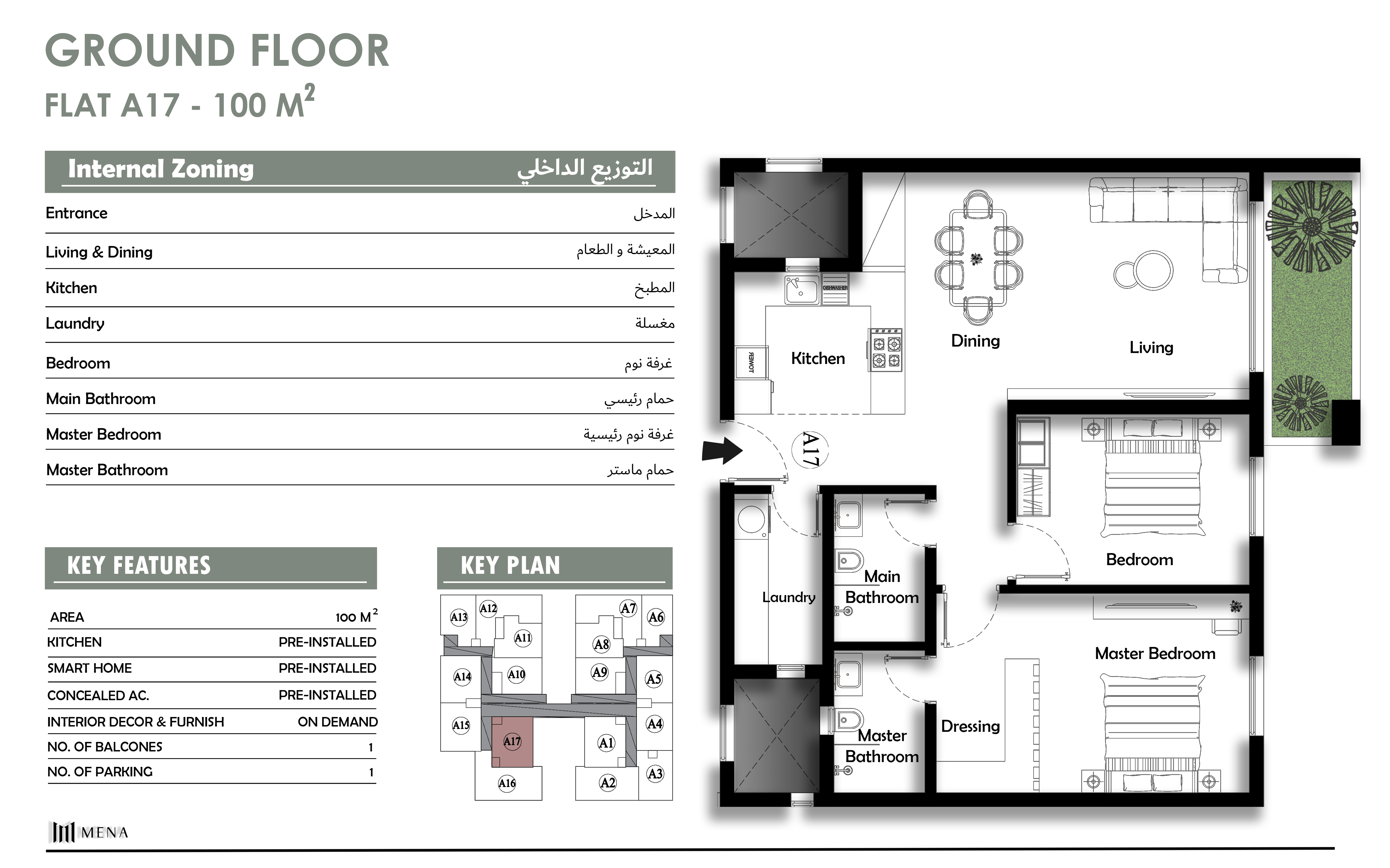 تضم: مدخل، صالة معيشة وطعام، مطبخ، غرفة غسيل، غرفة نوم، غرفة نوم رئيسية مع حمام ماستر وغرفة تبديل ملابس (Dressing)، بالإضافة إلى حمام رئيسي يخدم باقي الغرف.