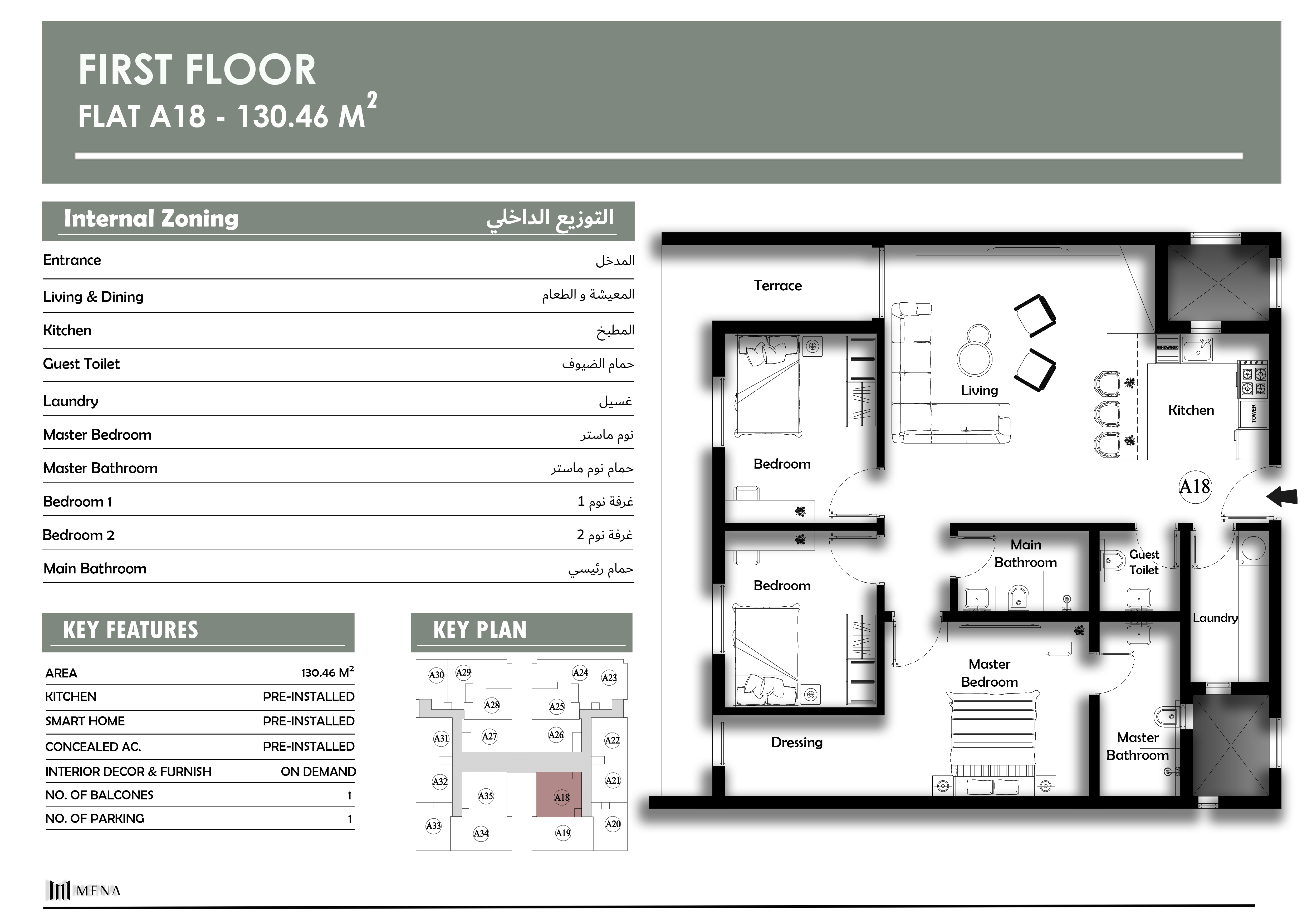 لشقة تقع في الدور الأول بمساحة إجمالية تبلغ 130.46 متر مربع، وهي من الشقق الكبيرة في المشروع.
