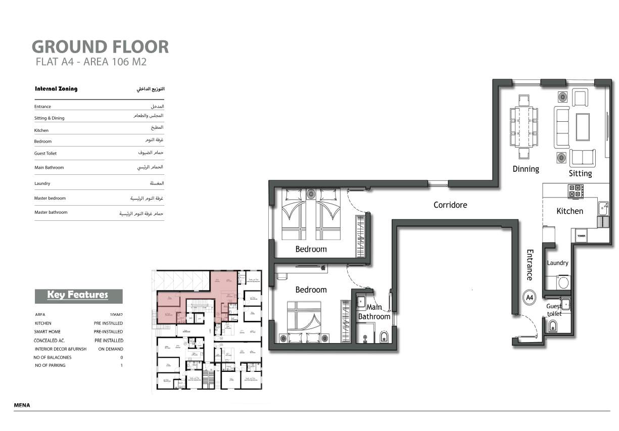 شقة A4 أرضية بمساحة 106 م² بتخطيط ذكي يفصل بين منطقة المعيشة المفتوحة (جلوس + طعام) والمطبخ من جهة، وغرف النوم عبر ممر طويل يمنح خصوصية من الجهة الأخرى. تضم غرفة غسيل قرب المدخل، وحمام ضيوف مستقل، مع تجهيزات سمارت هوم وتكييف مخفي وتشطيبات قابلة للتخصيص — خيار مريح وعملي للعائلات الصغيرة.