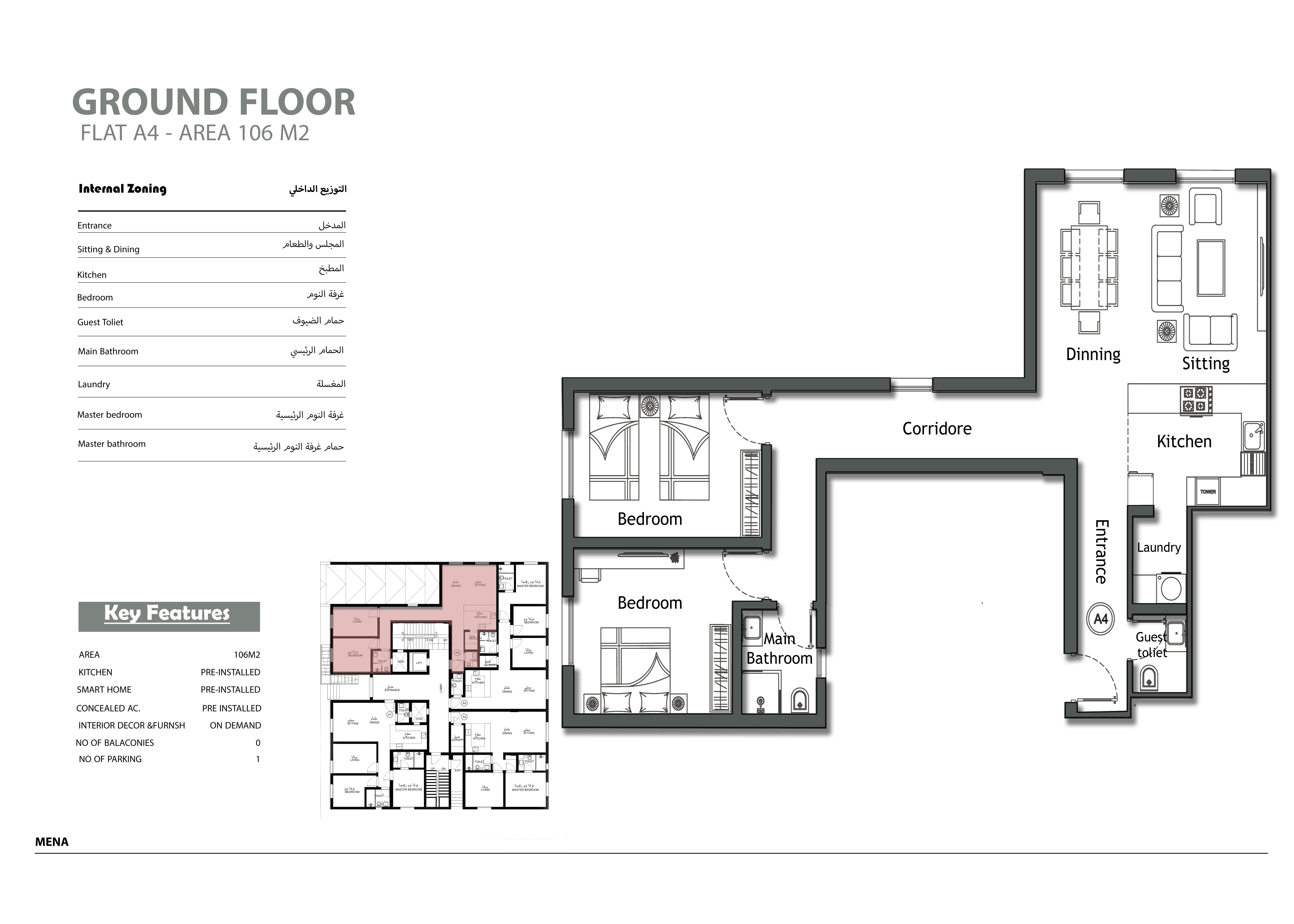 شقة A4 أرضية بمساحة 106 م² بتخطيط ذكي يفصل بين منطقة المعيشة المفتوحة (جلوس + طعام) والمطبخ من جهة، وغرف النوم عبر ممر طويل يمنح خصوصية من الجهة الأخرى. تضم غرفة غسيل قرب المدخل، وحمام ضيوف مستقل، مع تجهيزات سمارت هوم وتكييف مخفي وتشطيبات قابلة للتخصيص—خيار مريح وعملي للعائلات الصغيرة.