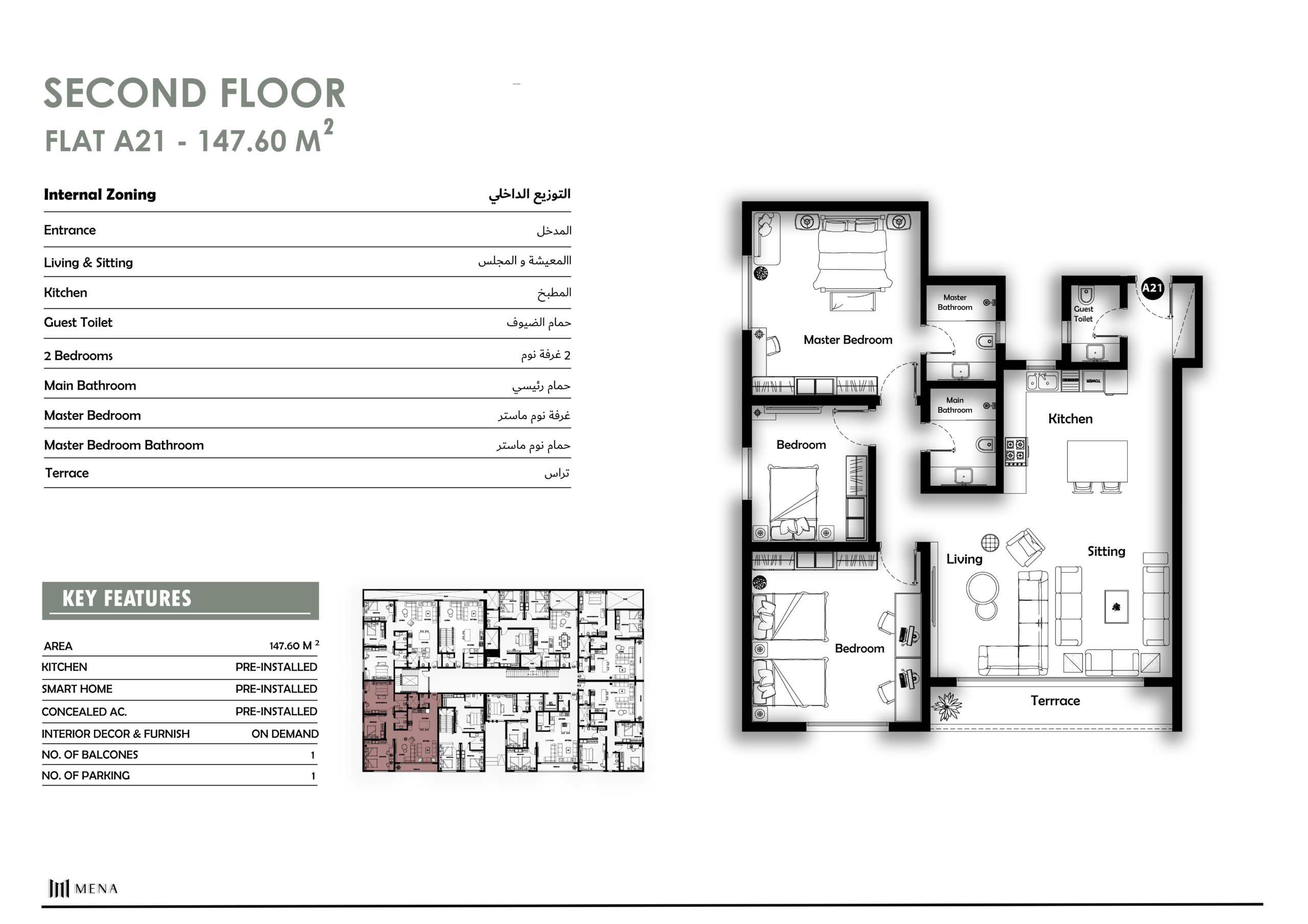 تقع هذه الشقة في الطابق الثاني بمساحة إجمالية 147.60 متر مربع، وتتمتع بتصميم أنيق يوفر توازنًا مثاليًا بين المساحات الخاصة والمشتركة. تضم الشقة ثلاث غرف نوم، بما في ذلك غرفة ماستر فسيحة مع حمام داخلي يوفر أعلى مستويات الخصوصية، إضافة إلى حمام رئيسي يخدم الغرف الأخرى وحمام ضيوف بالقرب من المدخل.
