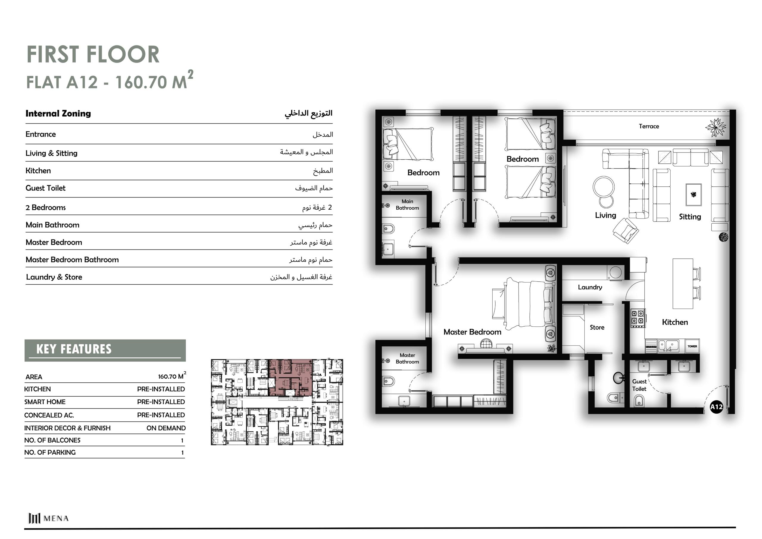 تقع هذه الشقة في الطابق الأول بمساحة إجمالية 160.70 متر مربع، وتُعد من الوحدات الواسعة التي تمنح ساكنيها إحساسًا بالفخامة والراحة. تتكون من أربع غرف نوم، بما في ذلك غرفة ماستر كبيرة بحمام داخلي خاص، بالإضافة إلى حمام رئيسي يخدم باقي الغرف وحمام ضيوف عند المدخل لراحة الزوار.