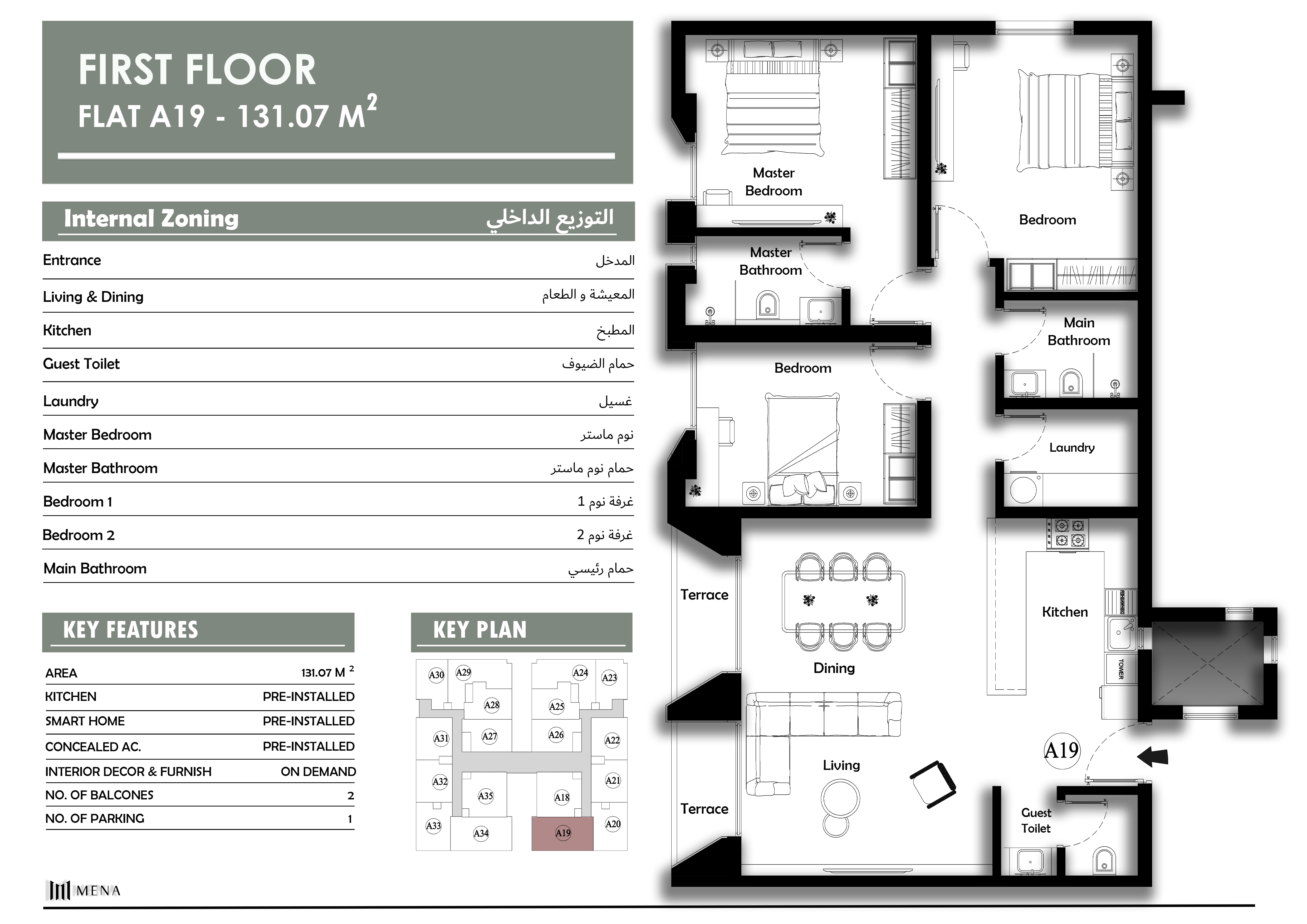 الشقة تقع في الدور الأول بمساحة إجمالية تبلغ 131.07 متر مربع.