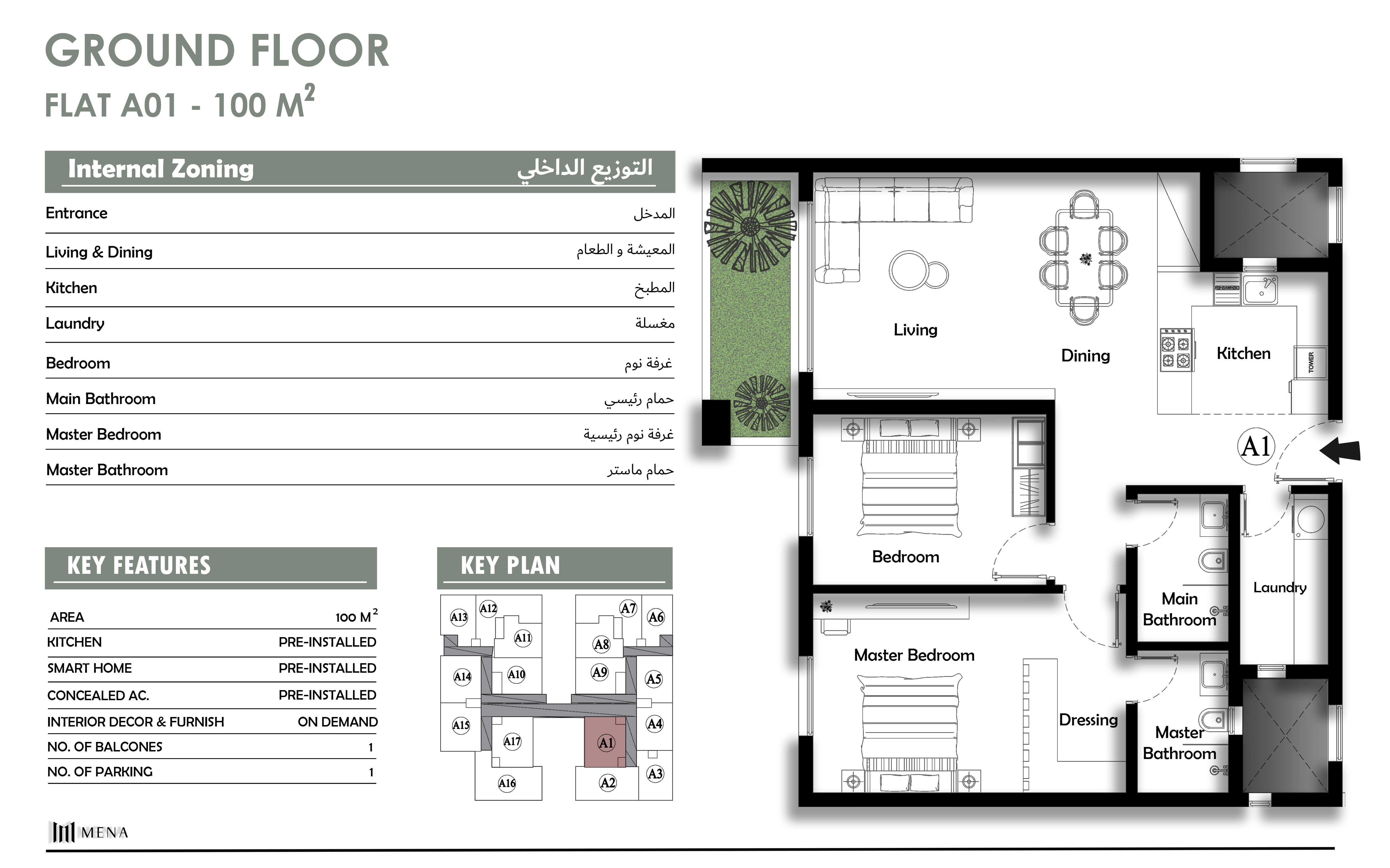 الشقة تقع في الدور الأرضي (Flat A01) بمساحة إجمالية تبلغ 100 متر مربع.