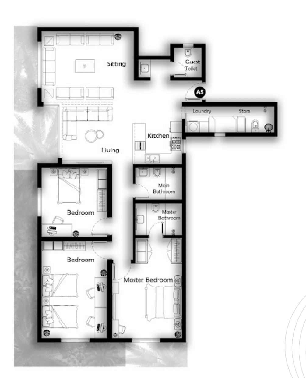 مدخل A5 يفتح على ممر قصير يضم دورة مياه للضيوف ويقود إلى مساحة استقبال واسعة بتخطيط مفتوح تجمع Sitting وLiving، فيما يتموضع المطبخ في الوسط على تماس مباشر مع منطقة المعيشة. الجناح الخاص يمتد على الواجهة السفلية، حيث غرفة نوم رئيسية مزودة بـ حمام داخلي، إضافةً إلى غرفتي نوم ثانويتين يخدمهما حمام رئيسي وُضع في قلب التوزيع. جناح الخدمات الجانبي يضم غرفة غسيل متصلة بـ مستودع، مما يعزز كفاءة التشغيل وفصل الحركة بين الضيافة والخصوصية.
