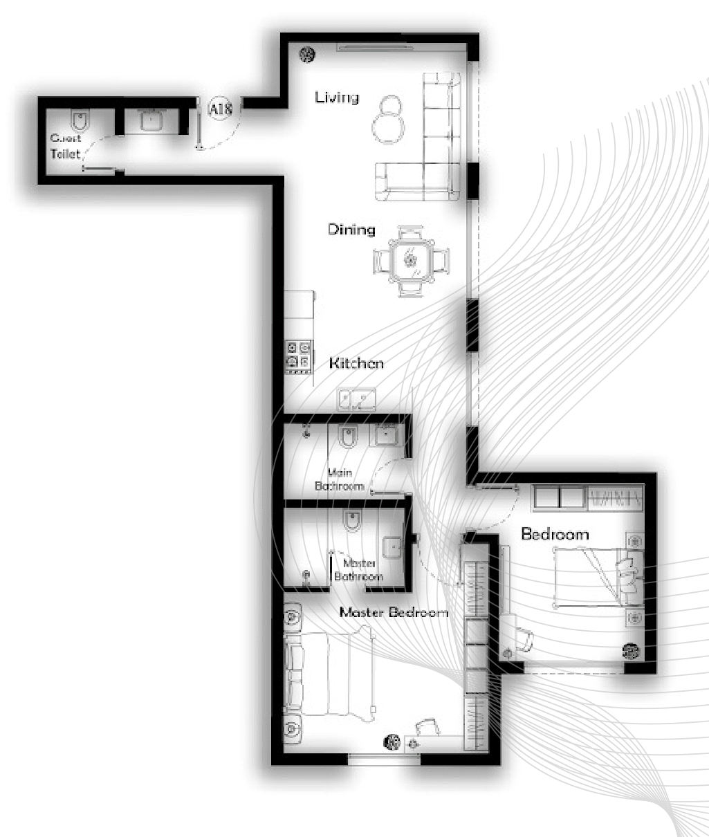 مدخل A18 يمر على دورة مياه ضيوف ثم ينفتح إلى فراغ طولي بتخطيط مفتوح يجمع Living وDining وKitchen على امتداد واحد. في الجناح الخاص توجد غرفة نوم رئيسية مزوّدة بـ حمام داخلي، وإلى جوارها غرفة نوم ثانية يخدمها حمام رئيسي يقع بالقرب من الممر؛ توزيع بسيط بمواضع واضحة يقلّل الحركة ويعزل الخصوصية عن منطقة الجلوس.