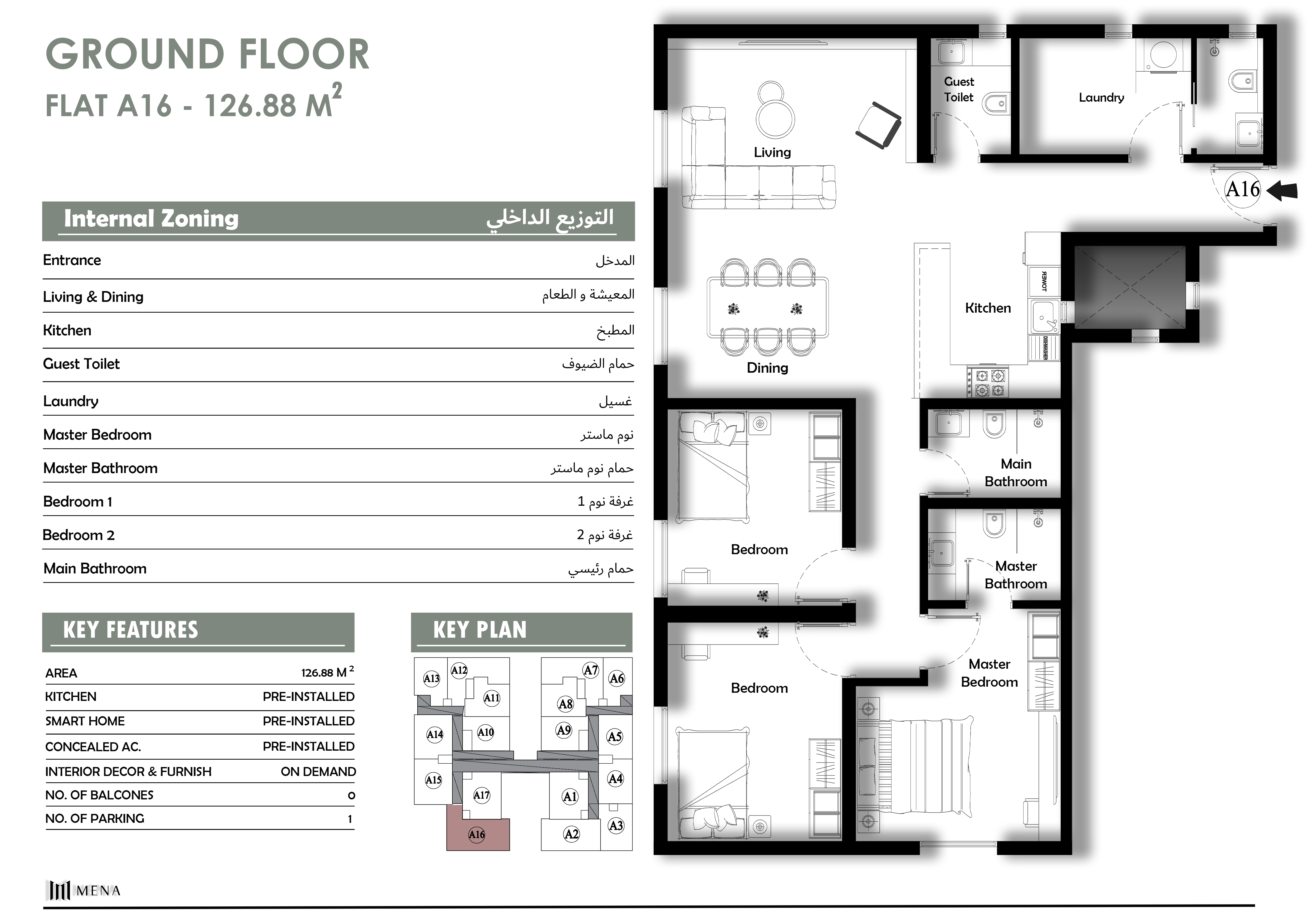 الشقة تقع في الدور الأرضي بمساحة إجمالية تبلغ 126.88 متر مربع، وهي الأكبر ضمن الشقق التي عرضتها حتى الآن.