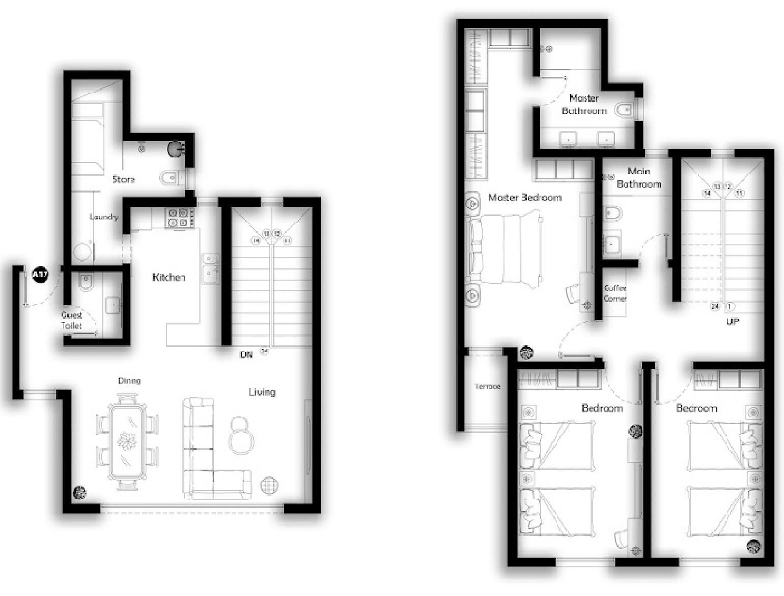 مدخل A17 يفتح على صالة Living متصلة بمنطقة Dining بتخطيط مفتوح، مع مطبخ شبه منفصل بمحاذاة الدرج. خلف المطبخ جناح خدمي يضم غرفة غسيل متصلة بـ مخزن ودورة مياه للضيوف. في الدور الأول يمتد الجناح الخاص ويضم غرفة نوم رئيسية بخزائن وحمام داخلي مع تراس، إضافةً إلى غرفتي نوم ثانويتين يخدمهما حمام رئيسي، مع ركن قهوة قرب بسطة الدرج لفراغ مرن.