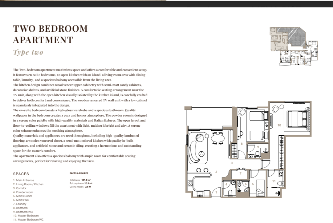 شقة غرفتين نوم بتوجيه غربي، مصممة لتجمع بين الراحة والفخامة، تتضمن مكان استقبال & طعام أنيق، مطبخ مجهز، حمام ضيوف، غرفة غسيل ملابس، غرفة نوم رئيسية مع دريسنج وحمام خاص، غرفة نوم ثانية بحمام خاص، غرفة خادمة مع حمام خاص، وتراس للاستمتاع بالإطلالة