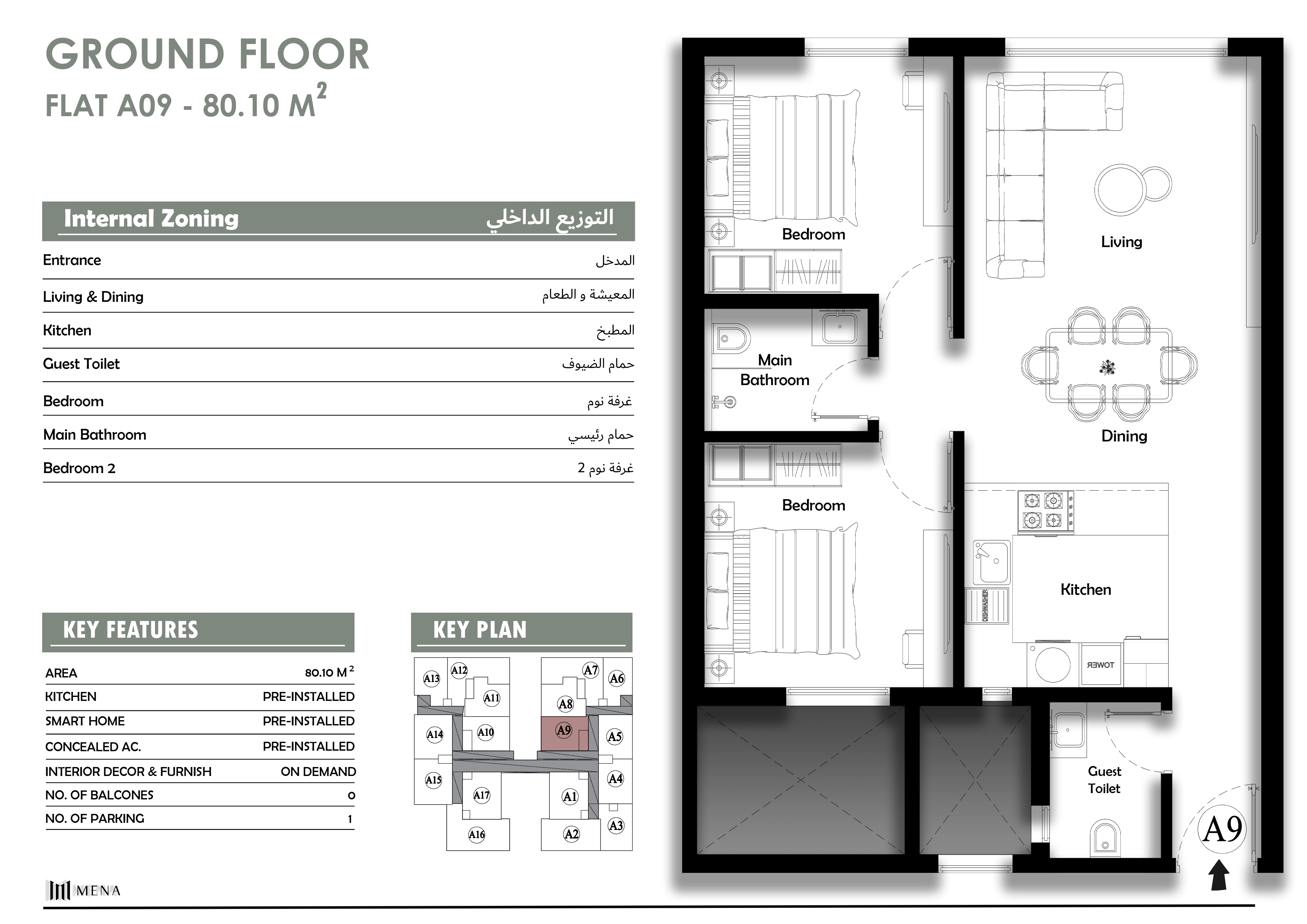 الشقة تقع في الدور الأرضي بمساحة إجمالية تبلغ 80.10 متر مربع.