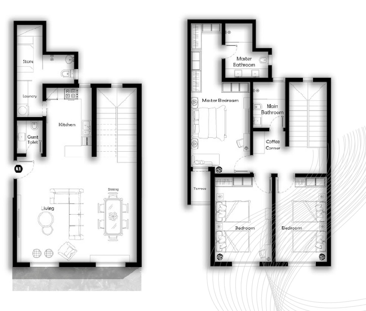 مخطط وحدة سكنية حديثة من طابقين؛ في الطابق الأرضي مدخل رئيسي (A1) يقود إلى صالة معيشة مفتوحة على منطقة طعام، مع مطبخ شبه منفصل بجوار السفرة، ويتصل بممر خلفي يضم غرفة غسيل ومخزن، إضافة إلى دورة مياه للضيوف، بينما يتوسط المسقط درج يربط الدورين. في الطابق الأول تتوزع منطقة خاصة تضم غرفة نوم رئيسية واسعة مع حمام داخلي مستقل، وحمامًا رئيسيًا مشتركًا يخدم غرفتي نوم ثانويتين متقابلتين، إلى جانب ركن قهوة صغير قريب من الدرج ومساحة تراس تمنح تهوية وضوءًا طبيعيين. التصميم يوازن بين فراغات الاستقبال في الأسفل وخصوصية غرف النوم بالأعلى مع مسارات حركة واضحة ووظائف خدمية متكاملة.