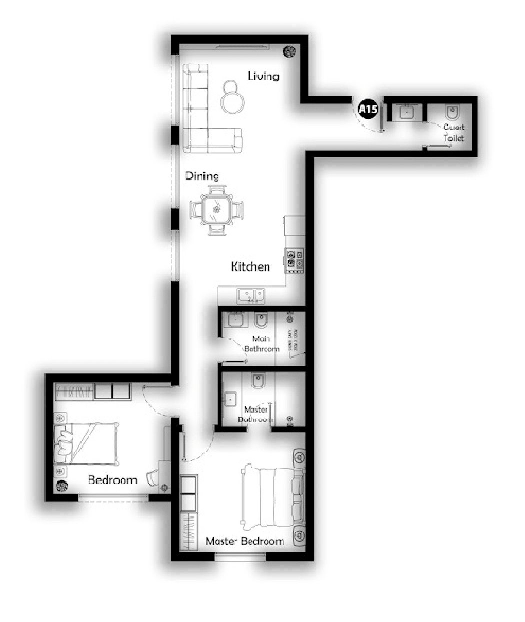 مدخل A15 يفتح على دورة مياه ضيوف، ثم يمتد فراغ اجتماعي طولي بتخطيط مفتوح يضم المطبخ في الوسط ويتصل بـ منطقة الطعام ثم المعيشة (Living) عند الواجهة. في الجناح الخاص يوجد غرفة نوم رئيسية مزوّدة بـ حمام داخلي، وإلى جوارها غرفة نوم ثانية يخدمها حمام رئيسي يقع قرب الممر بين غرف النوم. التوزيع يوفّر فصلًا واضحًا بين الضيافة والخصوصية ومسارات حركة قصيرة.