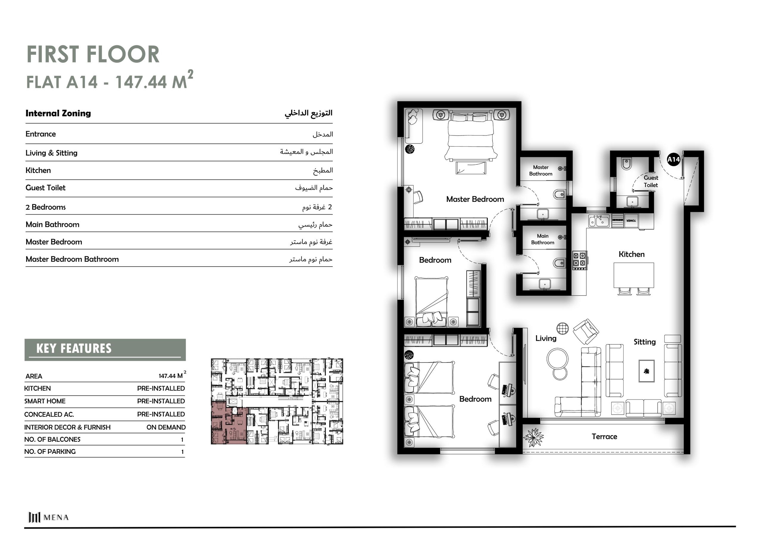 تقع هذه الشقة في الطابق الأول بمساحة إجمالية تبلغ 147.44 متر مربع، وتتميز بتصميم عصري يوفر توازنًا مثاليًا بين الراحة والعملية. تضم الشقة ثلاث غرف نوم، من بينها غرفة ماستر واسعة مزودة بحمام داخلي يضمن الخصوصية التامة، بالإضافة إلى حمام رئيسي يخدم باقي الغرف وحمام ضيوف بالقرب من المدخل.