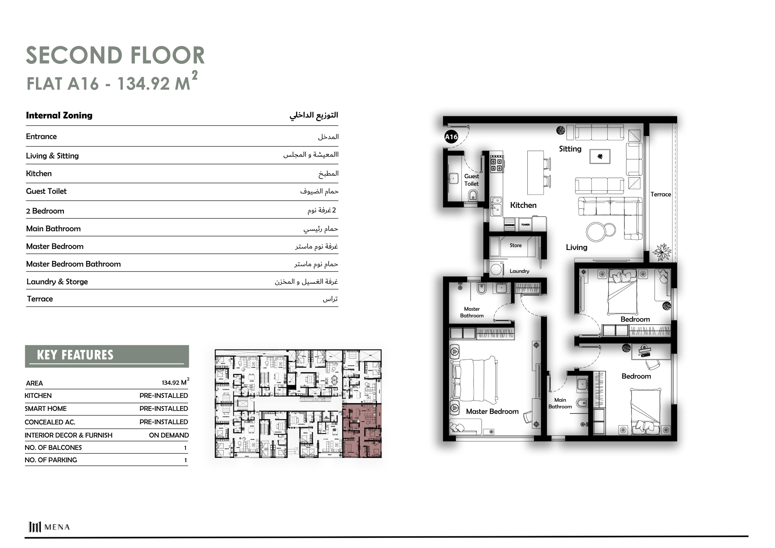تقع هذه الشقة في الطابق الثاني بمساحة إجمالية 134.92 متر مربع، وتتميز بتصميم عملي يجمع بين الأناقة والراحة. تتكون من ثلاث غرف نوم، من ضمنها غرفة ماستر واسعة مع حمام داخلي خاص، إضافة إلى حمام رئيسي يخدم باقي الغرف وحمام ضيوف قريب من المدخل لراحة الزوار.
