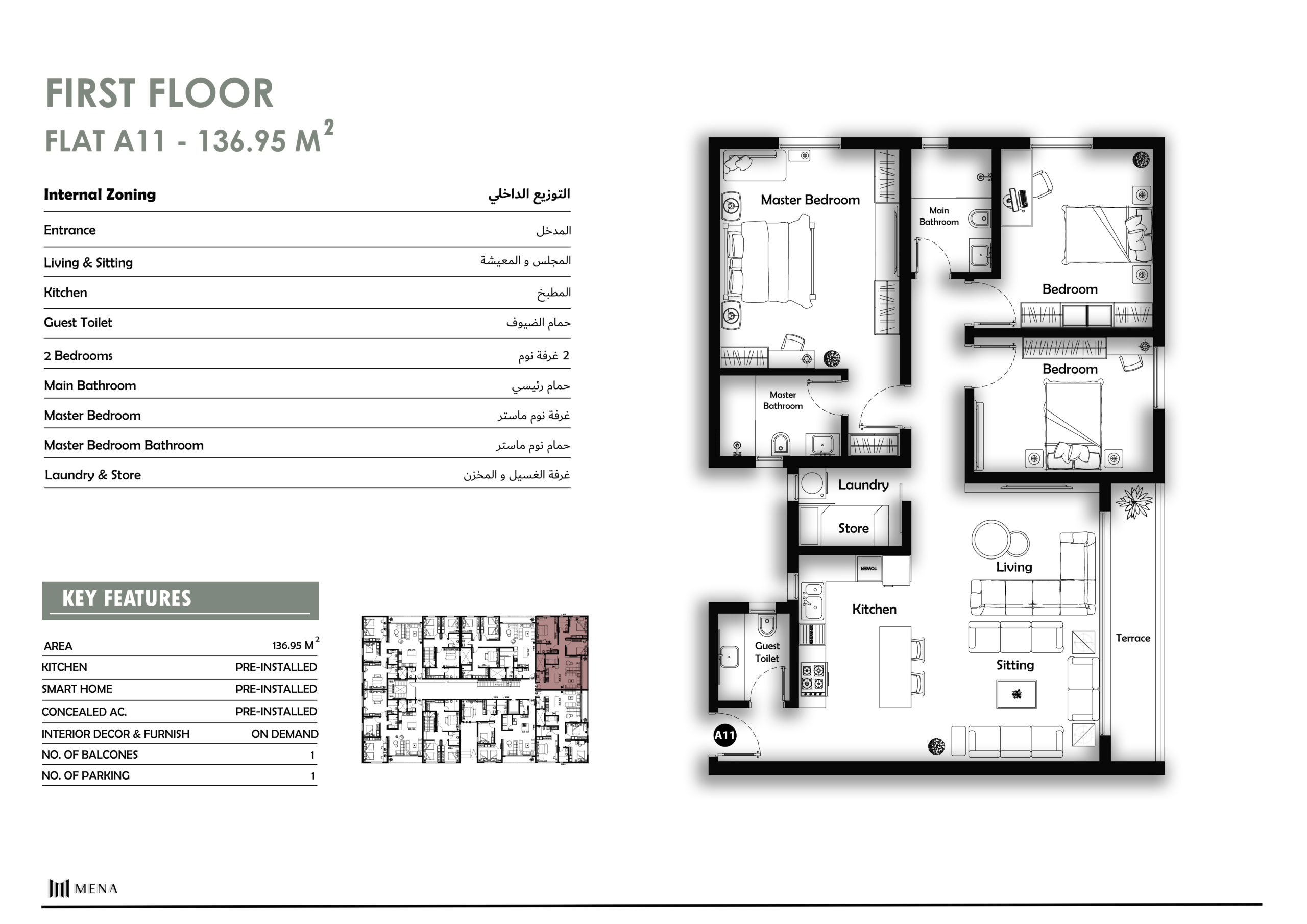 تقع هذه الشقة في الطابق الأول بمساحة إجمالية 136.95 متر مربع، وتتمتع بتوزيع داخلي مميز يجمع بين الراحة والعملية. تتكون الشقة من ثلاث غرف نوم، من ضمنها غرفة ماستر واسعة مع حمام داخلي، إضافة إلى حمام رئيسي يخدم الغرف الأخرى وحمام ضيوف بالقرب من المدخل.