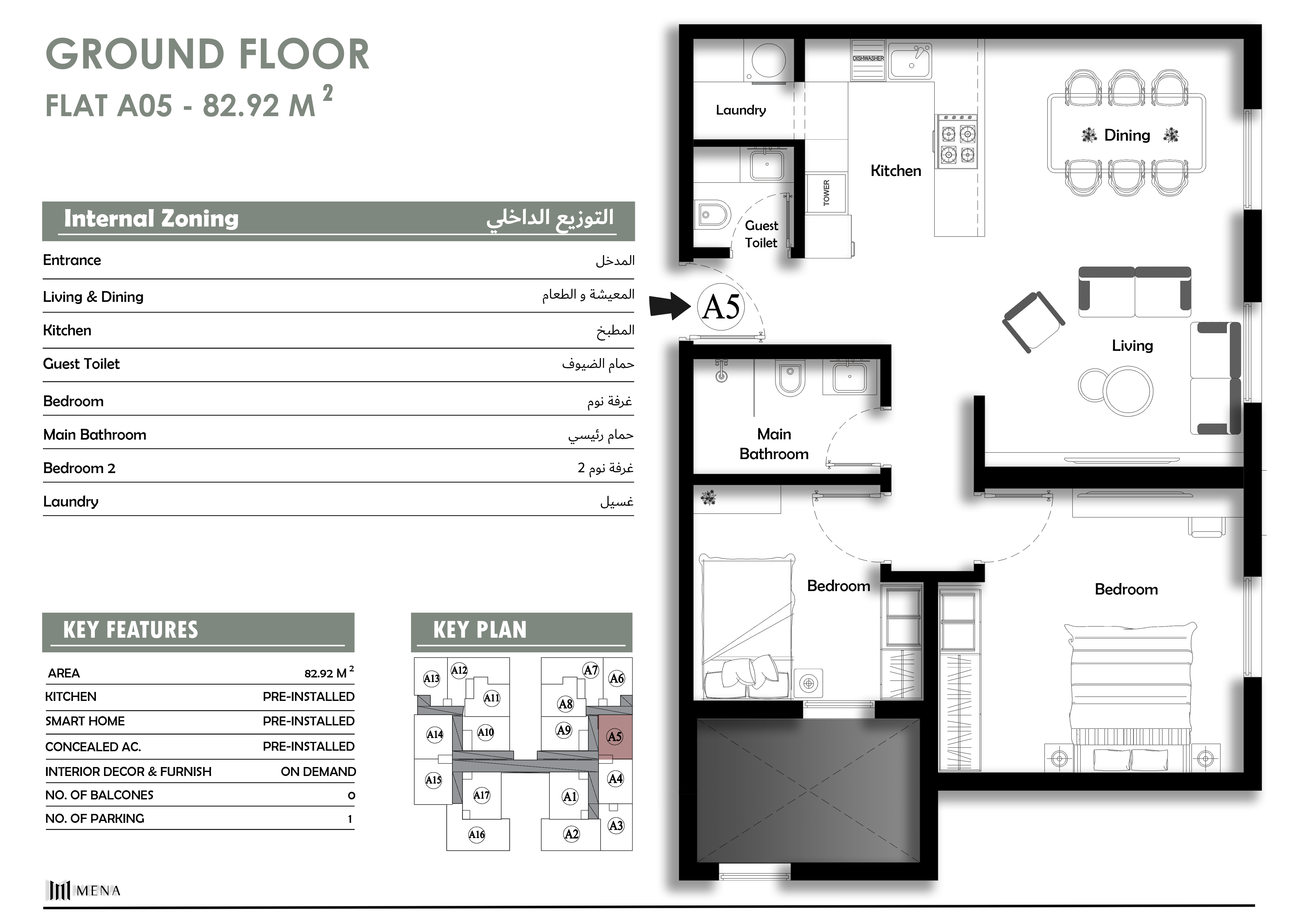تتكون من: مدخل، صالة معيشة وطعام، مطبخ، حمام ضيوف، غرفتين نوم، حمام رئيسي، وغرفة غسيل (Laundry).